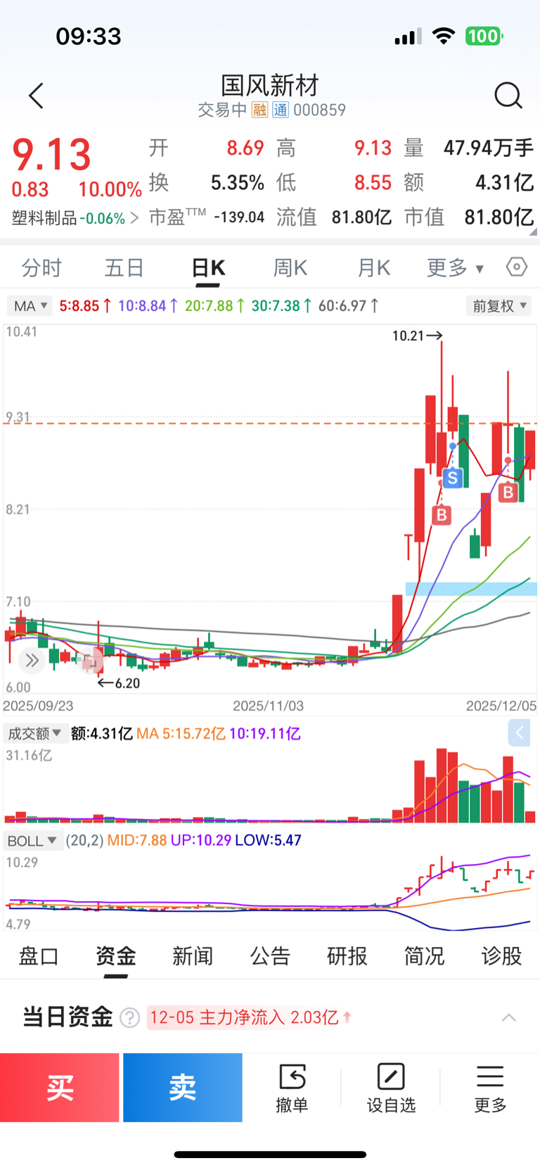 $国风新材(SZ000859)$ 哥哥们,我还在