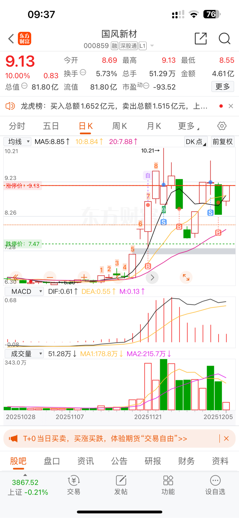 $国风新材(SZ000859)$ 没有一次踏在最好的买卖节点还得练
