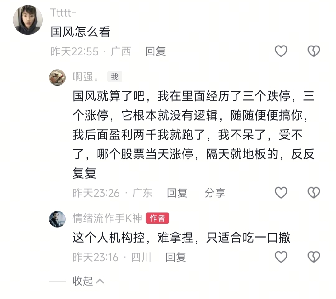 $国风新材(SZ000859)$ 我本人昨天就国风的评论,新来的慎入,我受不了,我绝对不买了