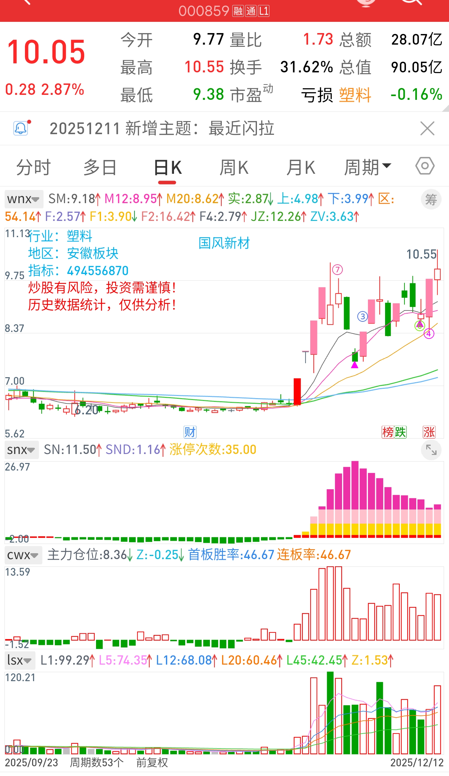$国风新材(SZ000859)$ #炒股日记# #复盘记录# #股市怎么看# #强势机会# #收盘点评# k线上是穿云形态中继。强势的很。涨停后一根阳线,有承接。