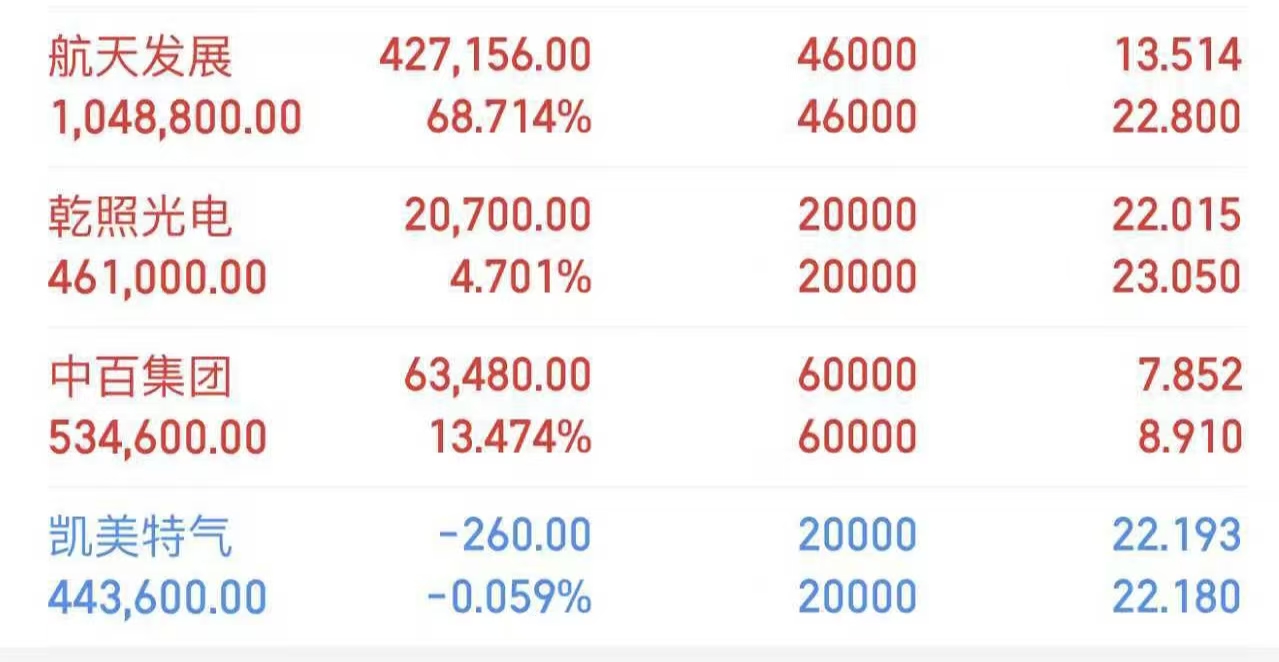 目前持股航天发展,乾照光电,这两个作为商业H天的底仓,只要航天发展不破位,就保持不动,格局到极致,零售方面布局中百集团,作为零售的补涨,同样百字的百大集团,东百集团都大涨过了,该轮到它了,另外则是昨天新布局的凯美特气,光刻胶概念,作为新题材切换,趋势不错,蛰伏芯片板块。