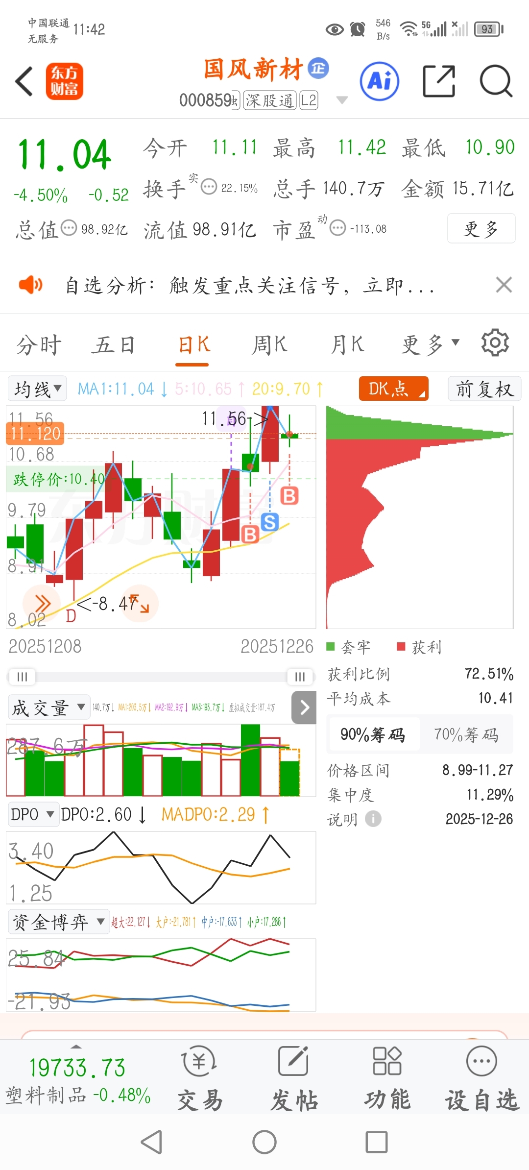 $国风新材(SZ000859)$ 昨天一直在11左右游荡,然后尾盘拉涨停,发现手中筹码不够,今天继续11左右吃货,尾盘还是涨停!我已经水下吃货了,你们自己看着办!昨天主力亏本,今天还出货?想啥呢?