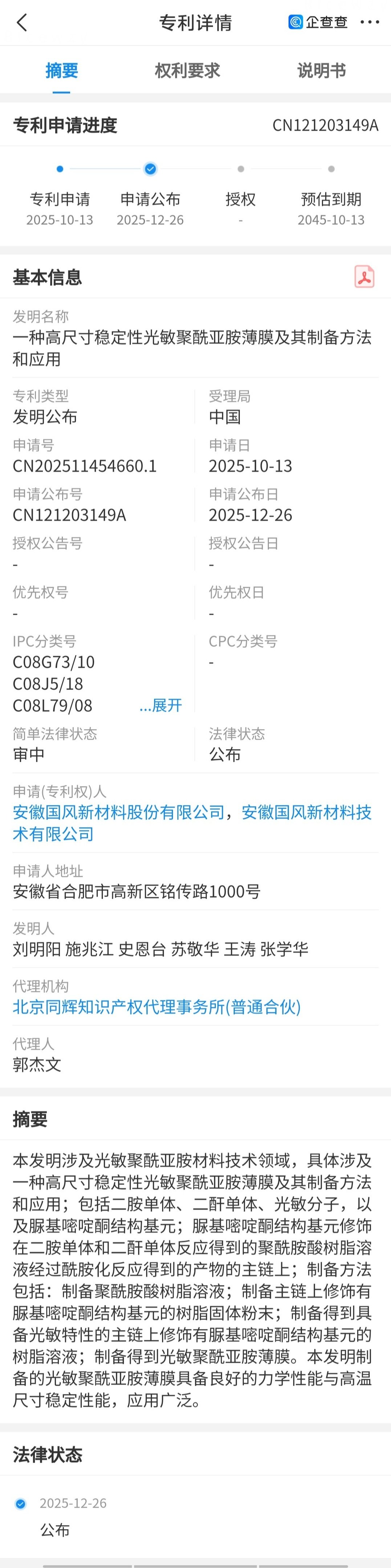 $国风新材(SZ000859)$ 高尺寸稳定性光敏聚酰亚胺(PSPI)光刻胶研发成功!