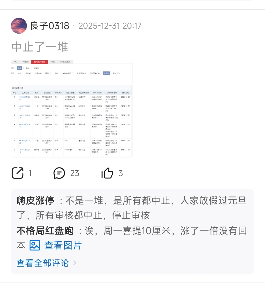$国风新材(SZ000859)$ 这人呢,有点坏,但是又有点无知,中止和终止都没搞清楚,中止提交材料再审核就行了,A股炒股炒预期,重组成功了就没得炒作了,唱空的无非就是前两天追高割肉的,自以为割对了