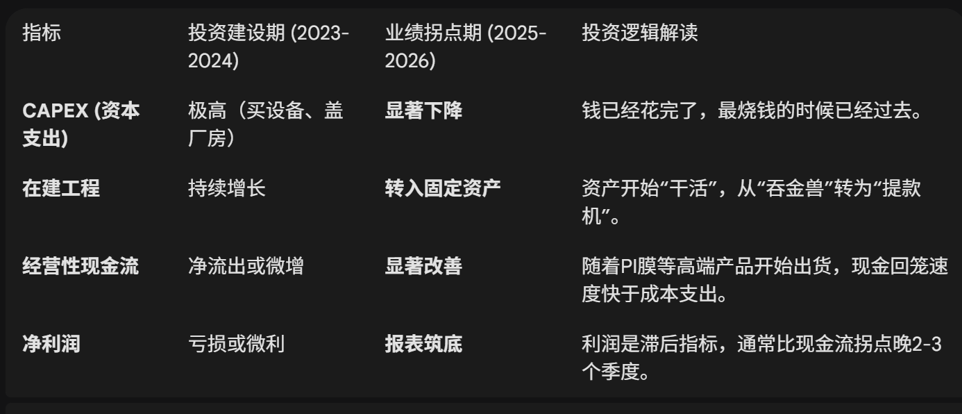 关键变量: 我们目前盯的是PI膜的产销率。只要订单持续流入,随着产量的增加,固定成本被摊薄,利润表会迅速在2026年实现“惊人”的扭亏。