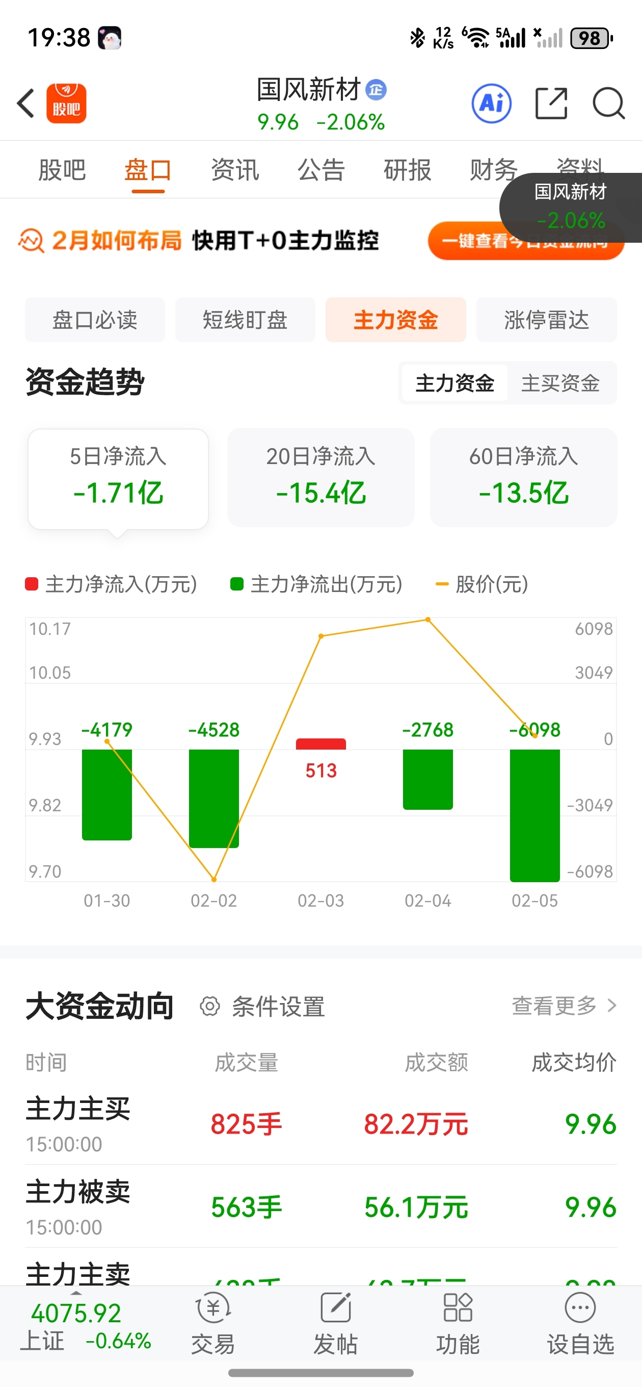 $国风新材(SZ000859)$ 今天主力跑了不少