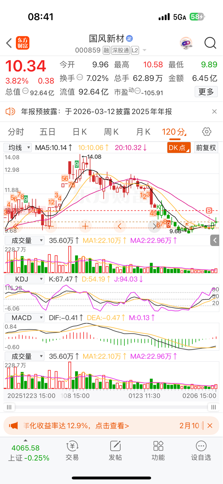 $国风新材(SZ000859)$ 120分钟MACD底背离,拐头向上,进场