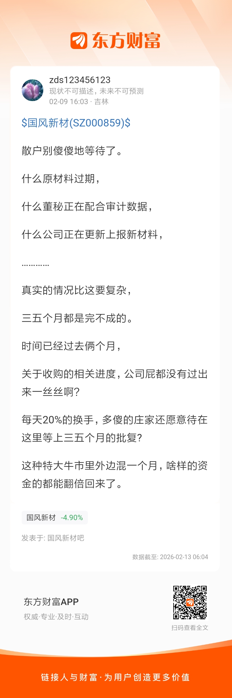 温馨提示: 1.根据《证券法》规定,禁止编造、传播虚假信息或者误导性信息,扰乱证券市场;2.用户在本社区发表的所有资料、言论等仅代表个人观点,与本网站立场无关,不对您构成任何投资建议。用户应基于自己的独立判断,自行决定证券投资并承担相应风险。《东方财富社区管理规定》