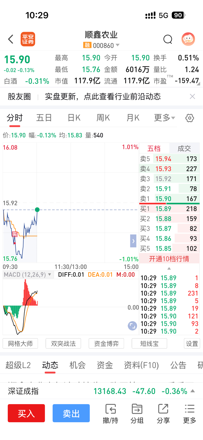 $顺鑫农业(SZ000860)$ 早上挂了15.8继续加仓,唯一可惜的是没加到最低点附近,今天15.77可以成交的,目前只要跌就加仓