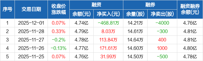 融资方面,当日融资买入621.3万元,融资偿还1090.11万元,融资净偿还468.81万元。融券方面,融券卖出400股,融券偿还4400股,融券余量14.21万股,融券余额217.54万元。融资融券余额合计4.76亿元。