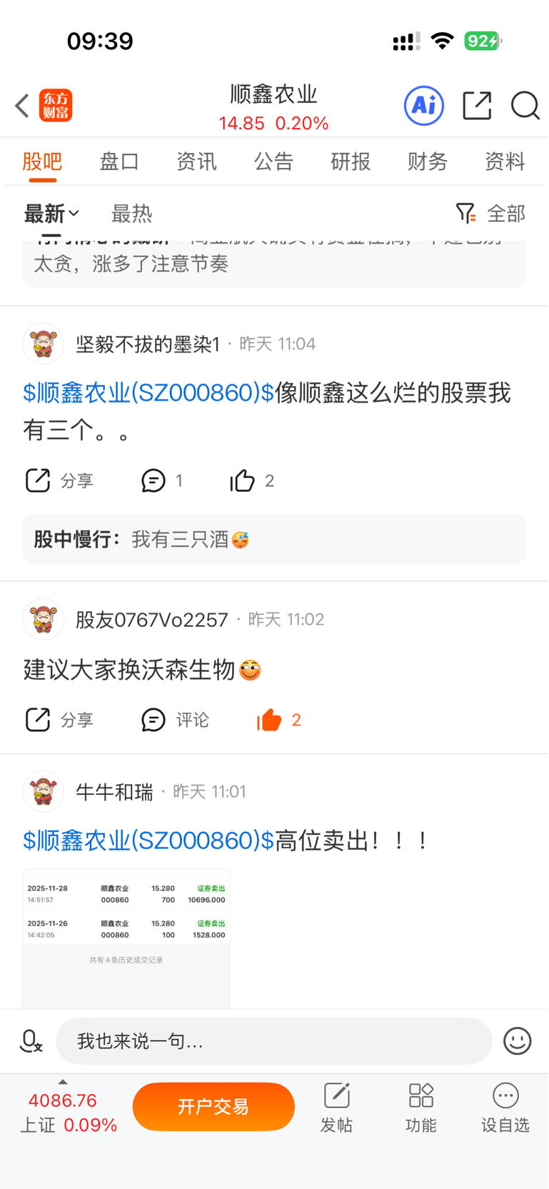 $顺鑫农业(SZ000860)$ 昨天卖了顺鑫,买了沃森,赚了6个多点了,比待在顺鑫强多了,兄弟们心眼活份儿点,别死守僵尸股了。