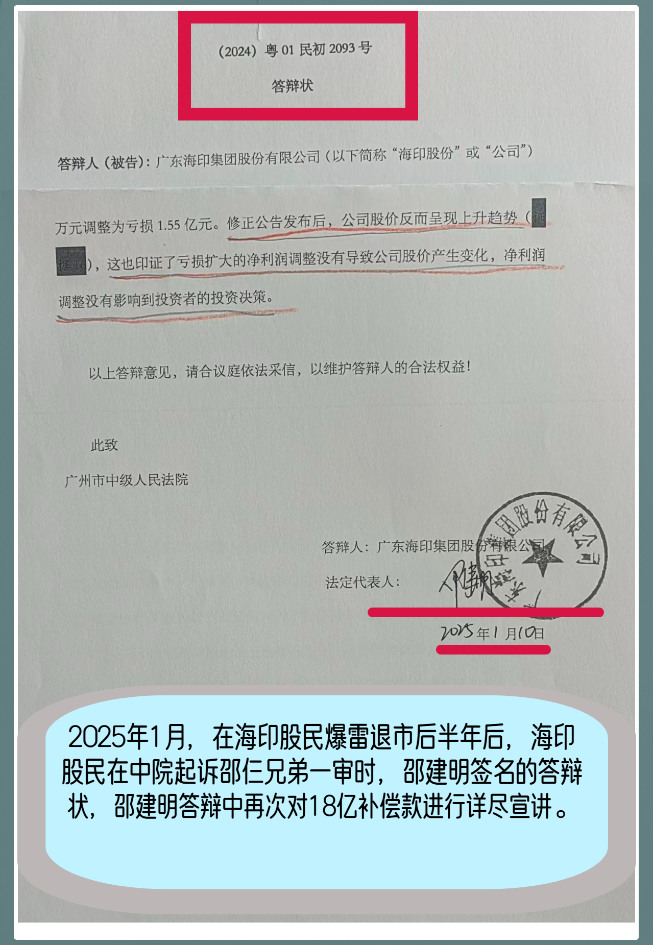 今年1月10日,海印实业盖章,并邵建明签署的答辩状是成功的,在李杰法官主持下并案审理的多案起诉邵仨的股民撤诉了。