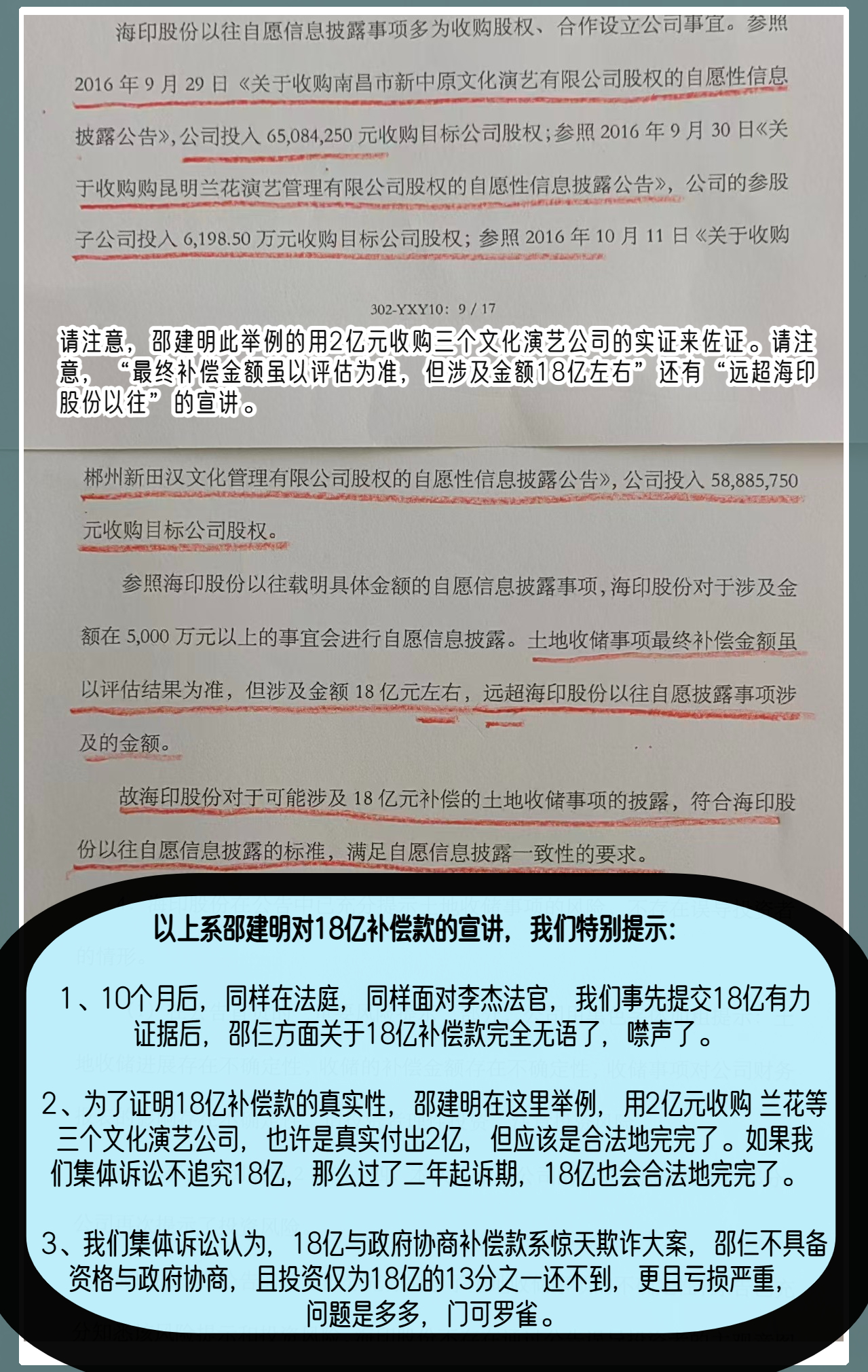 (2)为了佐证18亿的可信性,邵建明宣讲的以2个亿收购三个演艺、文化公司股权的公告,也许是实打实地付出了2个亿,但这2个亿的投入,应该是漂亮地、合法地完完了,否则目前海印市值不会只值不到6亿了。如果我们股民集体诉讼代表不追究18亿补偿款过了两年追索期,这18亿补偿应该也会漂亮地,合法地完完了。
