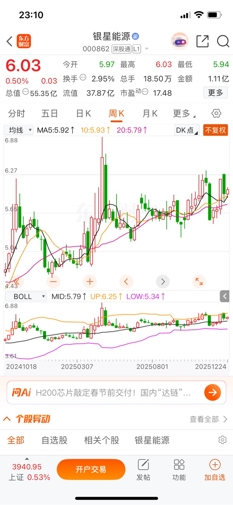 $银星能源(SZ000862)$  银星的周线显示,波浪形,慢慢向上爬走势。做多时间可能较长,买入主要看法背后的中铝。小赚就行。