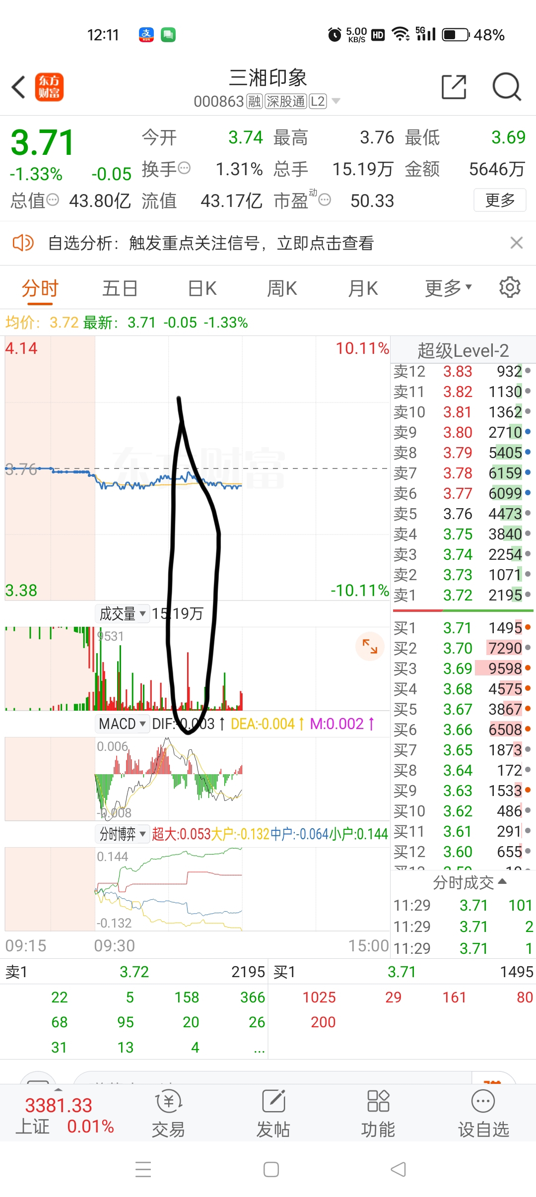 $三湘印象(SZ000863)$ 这个位置进的大单 就是明天割肉砸盘的大单 昨天进的大单就是今天割肉的大单 天天就是如此 高点越来越低 跌破3.66就是雪崩撑住上五日就是反转 主力不干活都去玩科技科 这里面的散户互相踩踏 别看几千首的卖和买都特么是散户