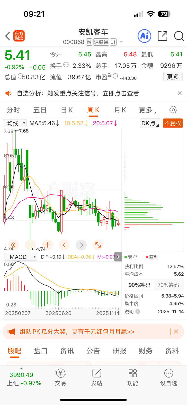 $安凯客车(SZ000868)$ 不知道你们慌什么,炒股被套不是正常,我做完T成本5.6元,你们炒股不做T还想赚钱?实在点学做T不要天天抱怨,