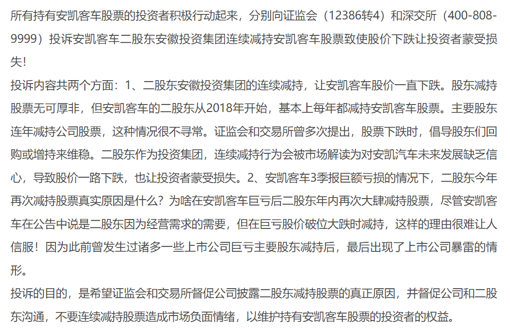 大家共同向深交所和证监会打电话投诉二股东连续减持致使股价破位下跌问题