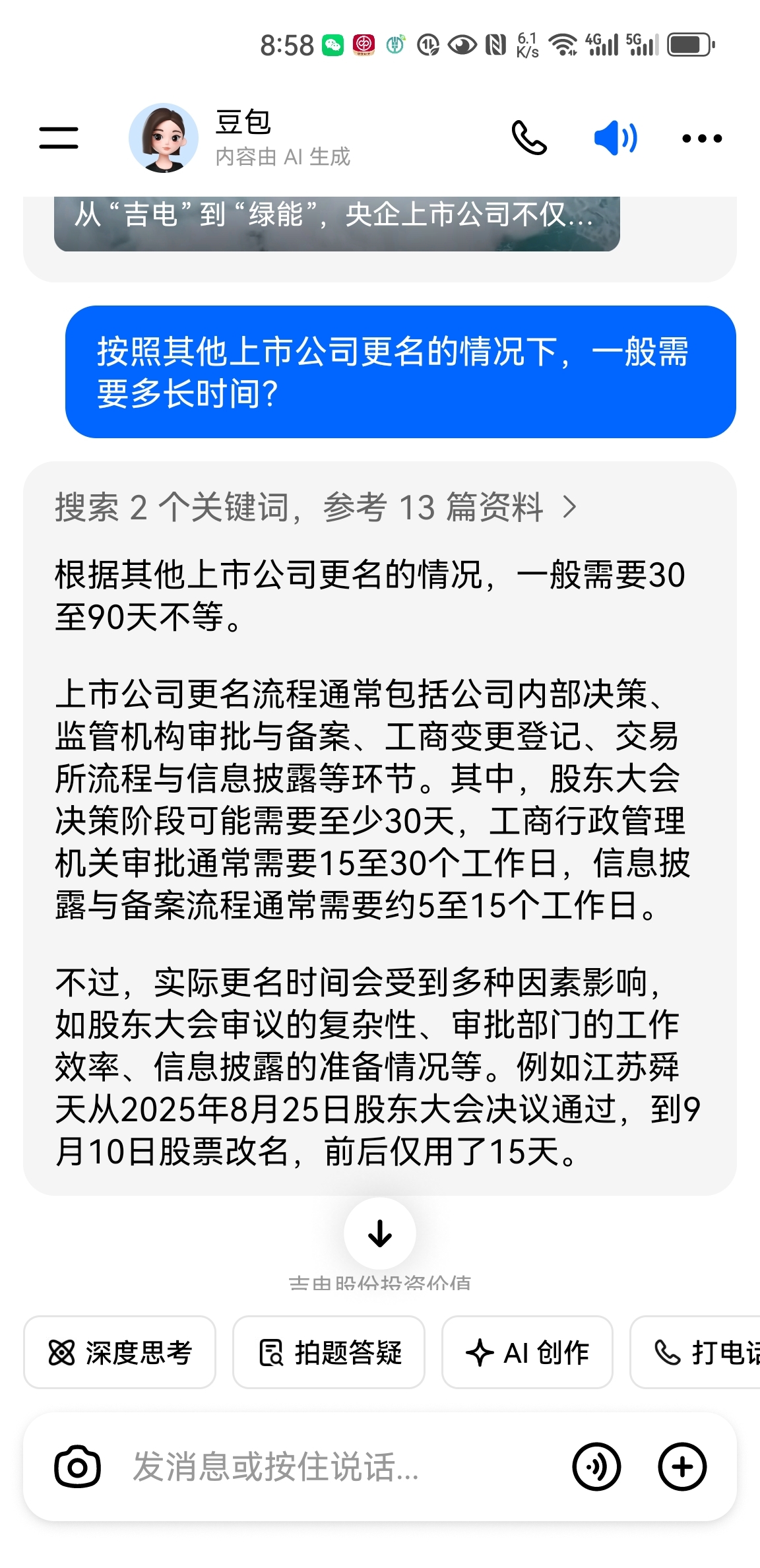 $吉电股份(SZ000875)$ 明天是提交更名的第29个工作日,豆包搜索更名为15至30个工作日,也就是说,最迟后天更名。