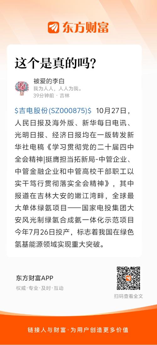 $吉电股份(SZ000875)$ 10月27日,人民日报及海外版、新华每日电讯、光明日报、经济日报均在一版转发新华社电稿《学习贯彻党的二十届四中全会精神|挺膺担当拓新局-中管企业、中管金融企业和中管高校干部职工以实干笃行贯彻落实全会精神》,其中报道在吉林大安的嫩江湾畔,全球最大单体绿氨项目——国家电投集团大安风光制绿氢合成氨一体化示范项目今年7月26日投产,标志着我国在绿色氢基能源领域实现重大突破。