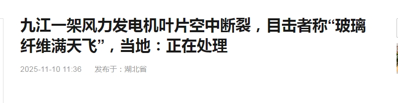 11月9日,江西九江鄱阳湖服务区附近,有网友发布视频显示,一架风力发电机的叶片突然折断坠落,断裂的叶片散落大量碎片与碎屑,部分轻质碎屑随风飘向周边区域,引发路过者关注。