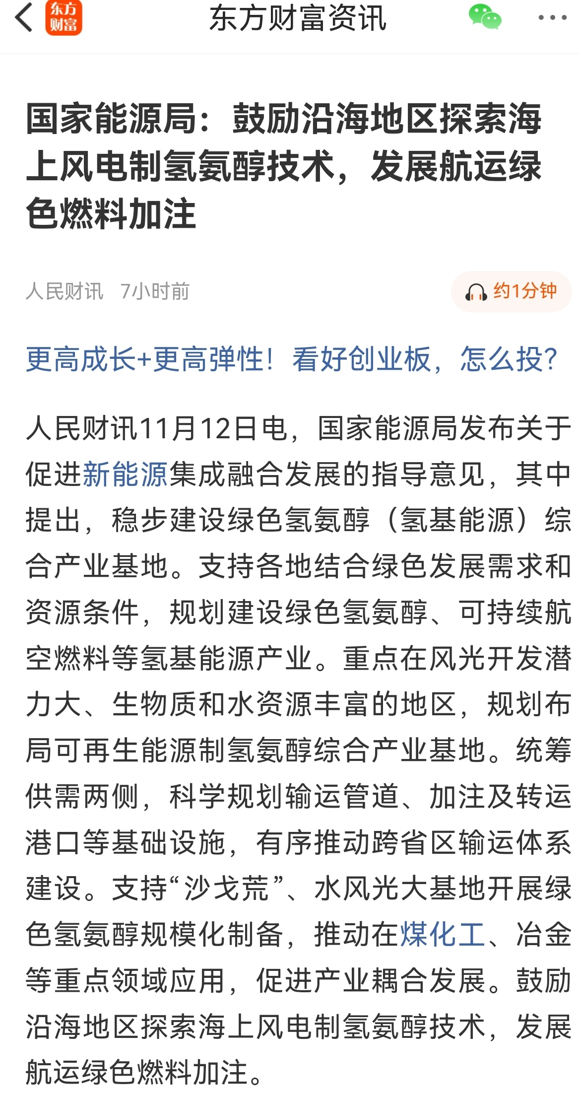 $吉电股份(SZ000875)$ 国家能源局:鼓励沿海地区探索海上风电制氢氨醇技术,发展航运绿色燃料加注