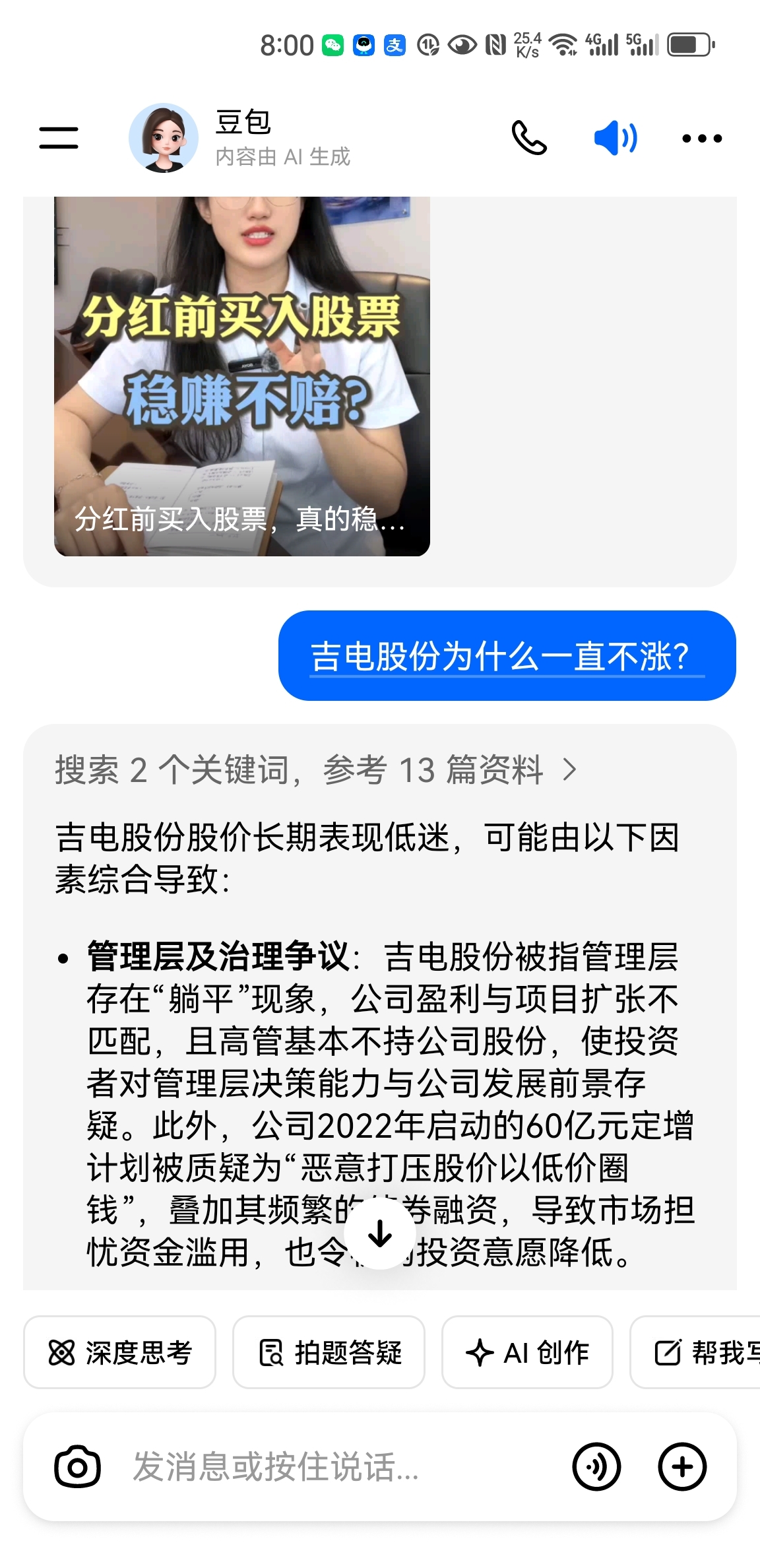 豆包评价吉电股份管理层躺平,恶意低价增发。