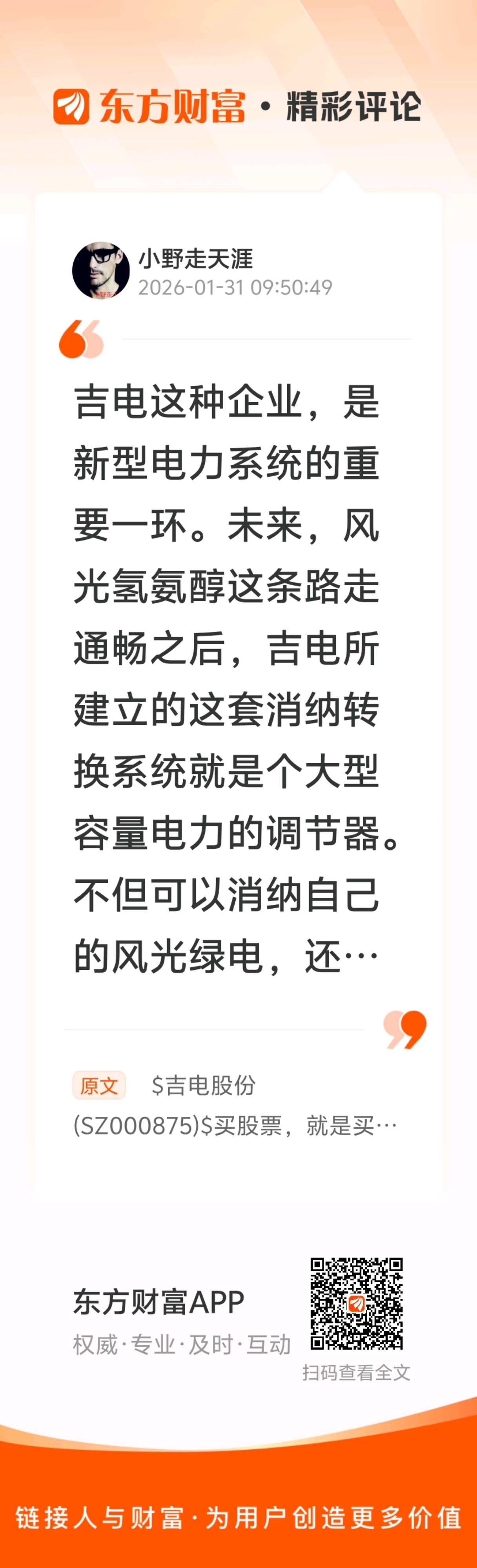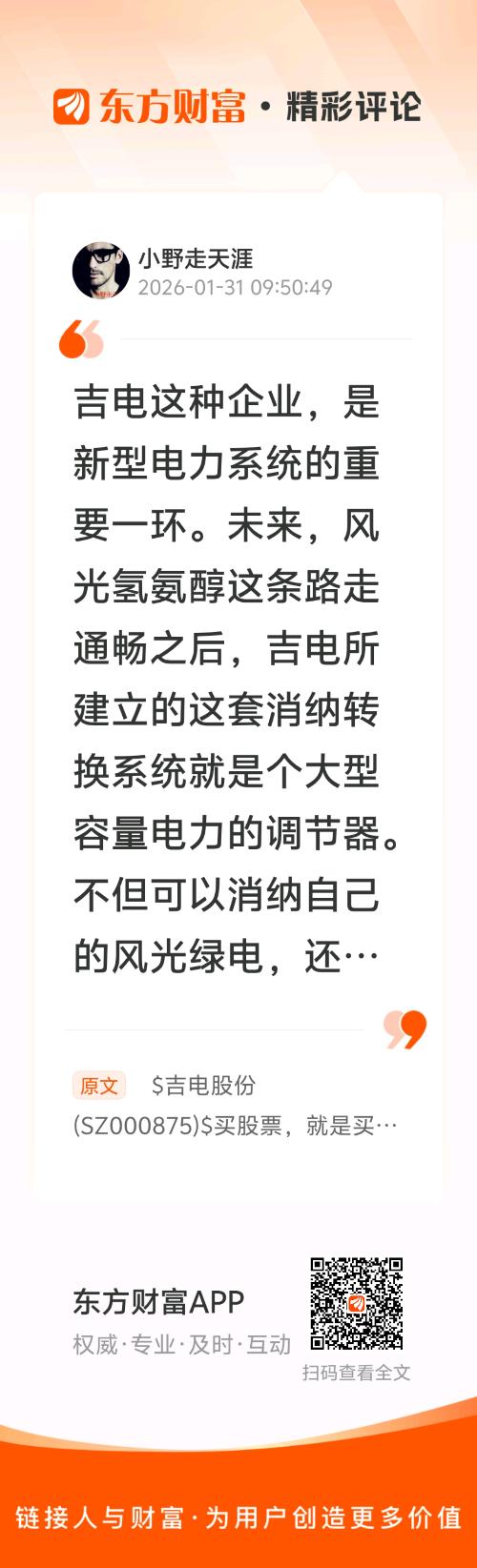 //@小野走天涯 :吉电这种企业,是新型电力系统的重要一环。未来,风光氢氨醇这条路走通畅之后,吉电所建立的这套消纳转换系统就是个大型容量电力的调节器。不但可以消纳自己的风光绿电,还可以消纳其他企业用不了的风光电。再者,吉电自己就可以绿电直连,自己消纳能力强,自己就可以是一个小循环,可吸可吐,当然也能拿到容量电价。这就是新型电力系统,最有价值的最关键的一个环节:容量电力调节(储能这个词有点low),关键时刻能顶上。谁可以进行容量电力调节,谁就是王者,新型电力系统就让谁躺赚、暴富。