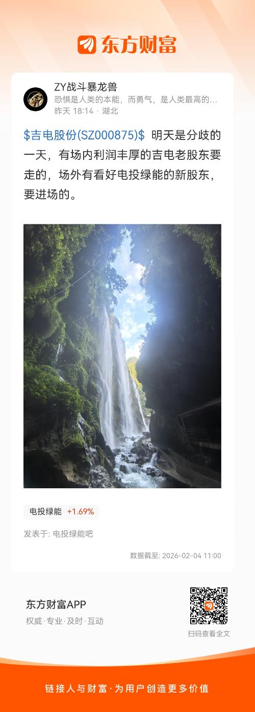 $吉电股份(SZ000875)$  明天是分歧的一天,有场内利润丰厚的吉电老股东要走的,场外有看好电投绿能的新股东,要进场的。