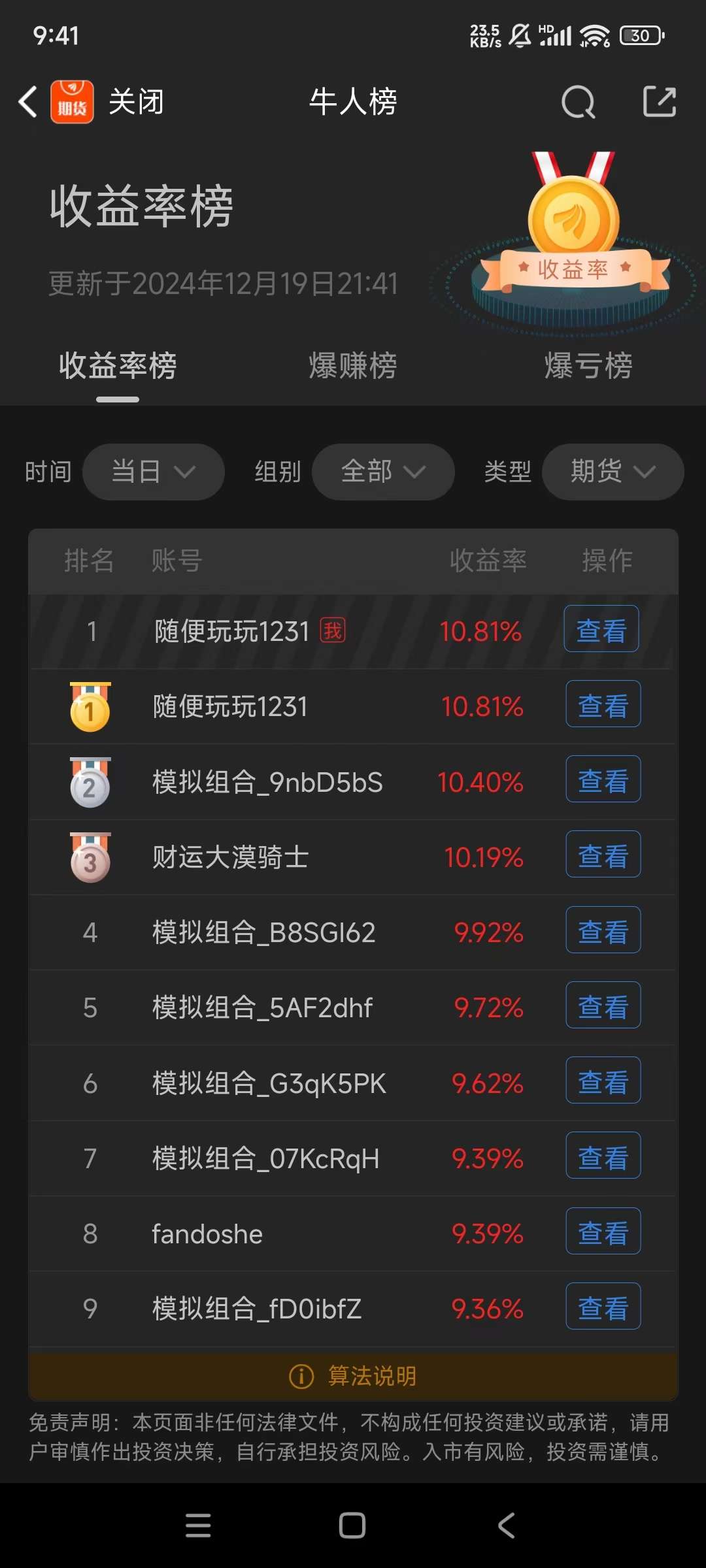 再贴个以前参加期货模拟盘的截图,虽然只是两个小时的榜首,不过我觉得还是很值得纪念的。后面是做空大A股指没止损收益率就给跌回去了,有兴趣可以去看看。
