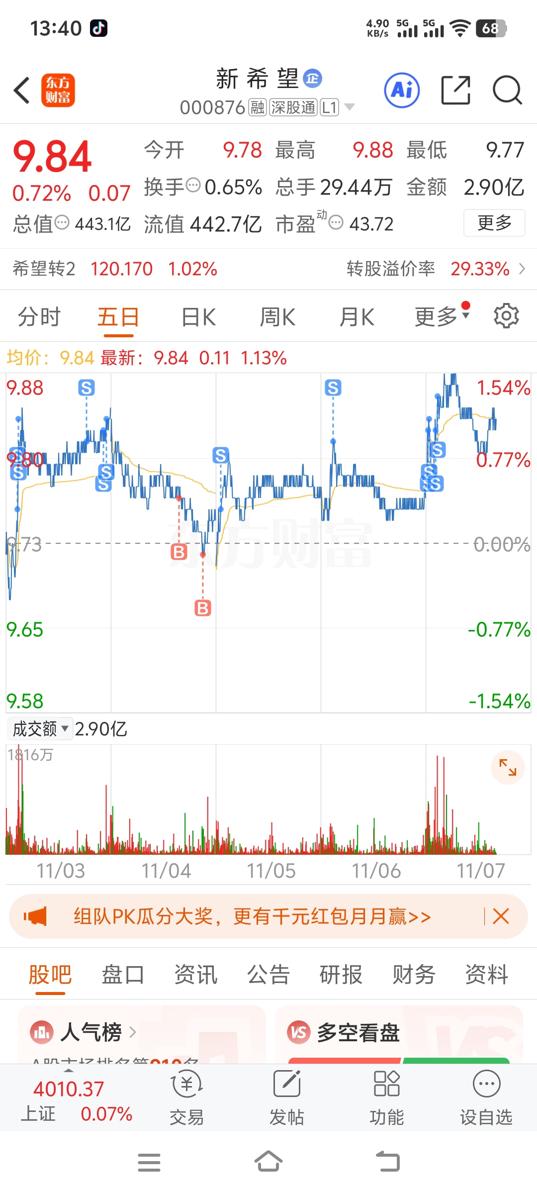 $新 希 望(SZ000876)$ 100多个的仓位每天设置买卖点 基本不用看盘 每天T+0 要么隔天T 只打一只股 低买高卖 这玩意不要格局