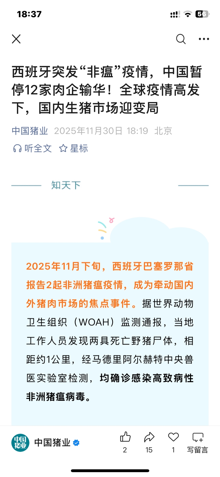 $新 希 望(SZ000876)$ $牧原股份(SZ002714)$ 明天开盘抢筹,欧洲非洲猪瘟,西班牙暂停对华出口猪肉