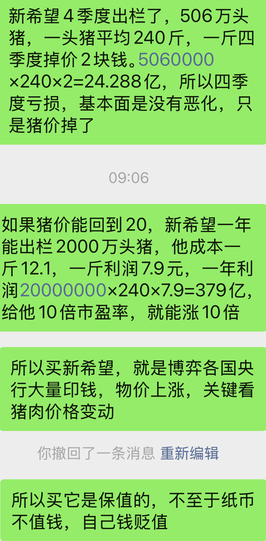 $新 希 望(SZ000876)$ 我觉得这个说得不错,新希望涨不涨,关键看猪肉价格涨不涨,这跟经济周期有关系。