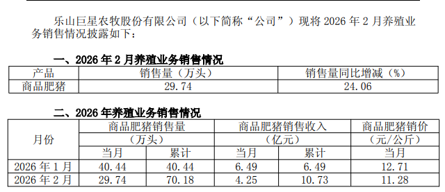 微成都报道3月9日,巨星农牧(603477.SH)披露2026年2月养殖业务销售情况。公司2月商品肥猪销售量29.74万头,同比增长24.06%;商品肥猪销售收入4.25亿元,商品肥猪销价11.28元/公斤。