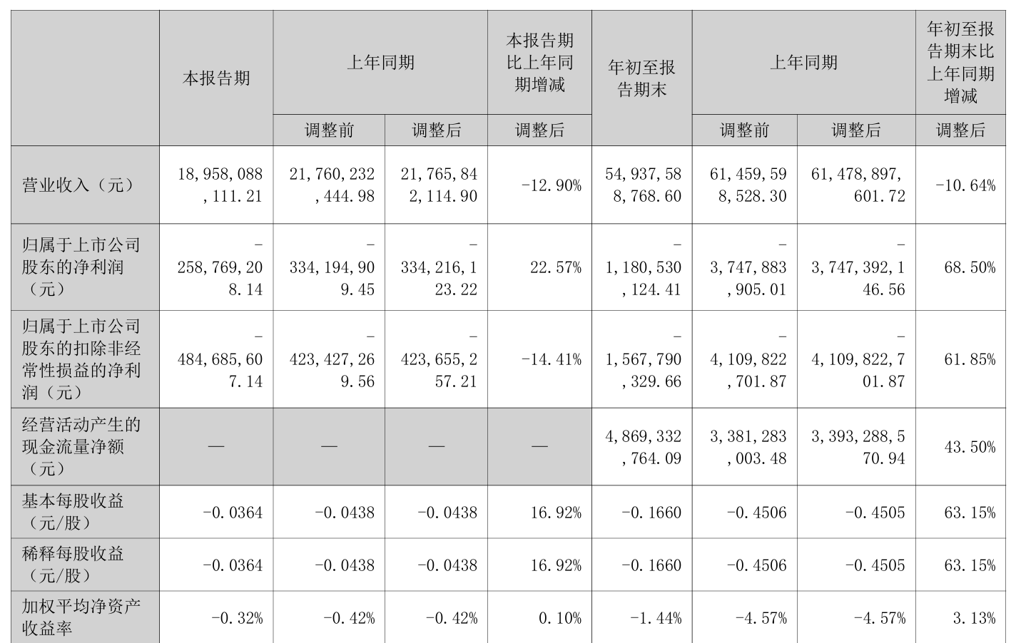其中,第三季度,公司实现营收189.58亿元,同比减少12.90%;归母净利润亏损2.59亿元,同比减亏22.57%;扣非净利润为-4.85亿元,同比增亏14.41%。