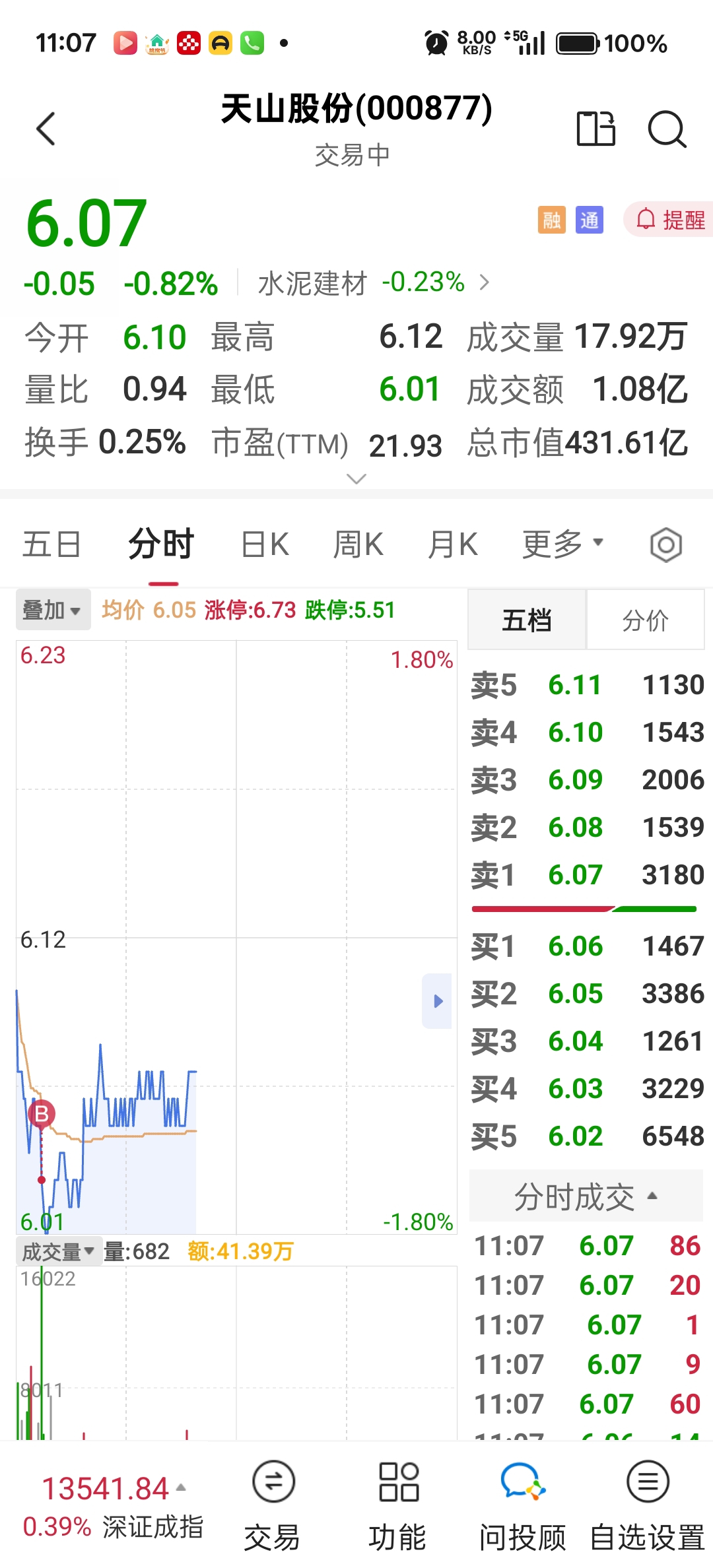 $天山股份(SZ000877)$ 收在6.07,午饭加个鸡腿