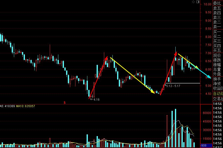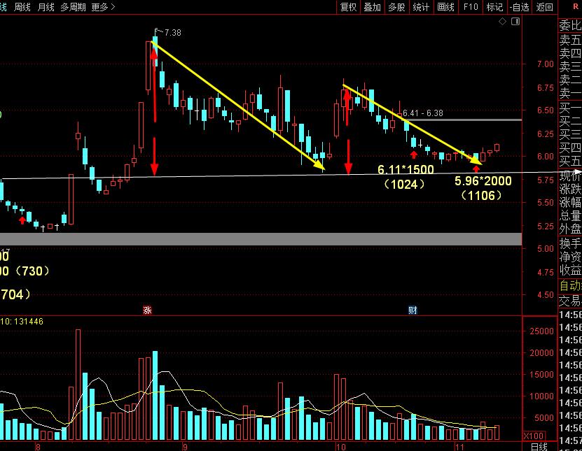 短周期,天山股份日K,已有一个较为完整的结构了。白色的支撑线我认为暂时有效,所以下3500股的单,如果它能下来5块附近,那再下双单就可以了。