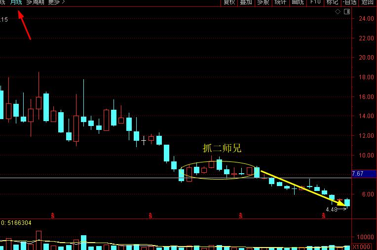 天山股份月K线。7块多时选择来抓二师兄,可惜了,二师兄不知道是失足还是有意跳崖了。(黄色箭头这一段)