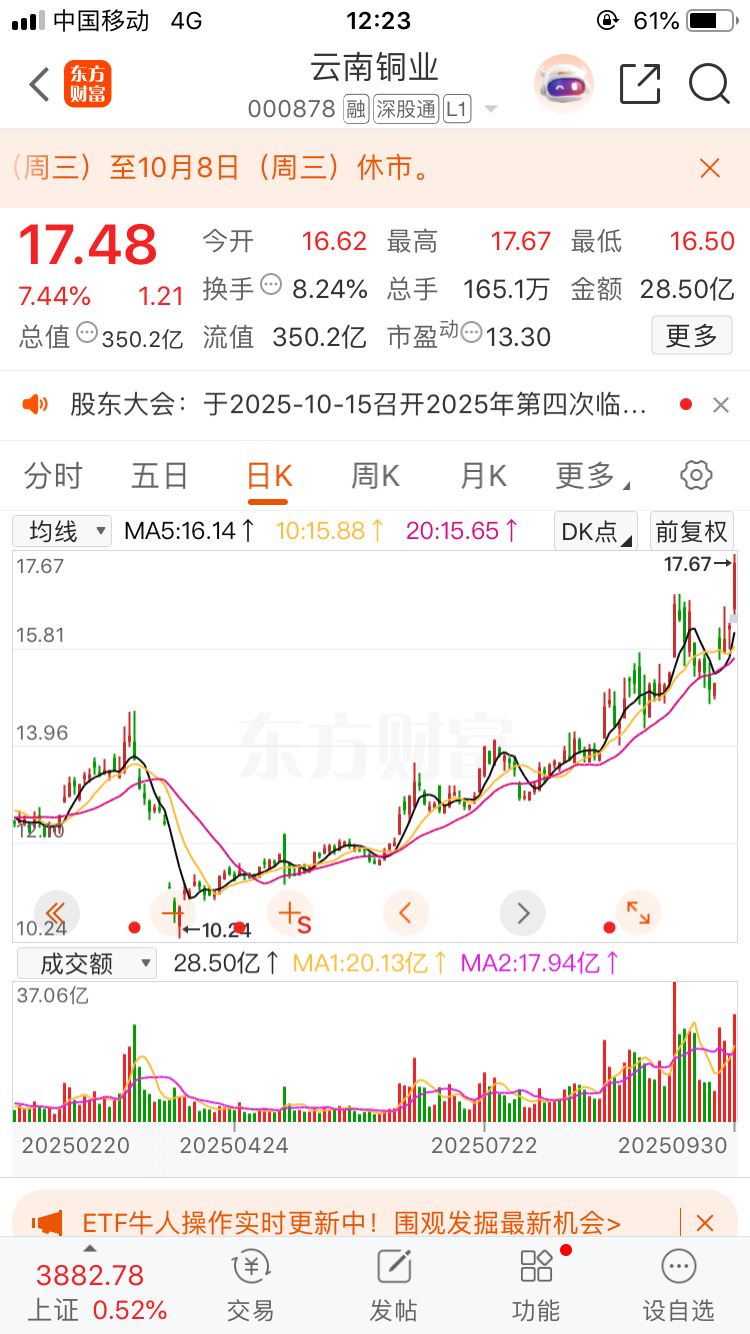 $云南铜业(SZ000878)$ 云南铜业情绪价值就摆在这,看下图,突破放量,肯定看涨,满仓干就错了,后市肯定还会向割一波,主力带散户飞,不附合逻辑呀。这个位詈最多三分之一的仓位,下跌破位加到半仓,留半仓抄主力的老底,小跌小抄,大跌大抄。