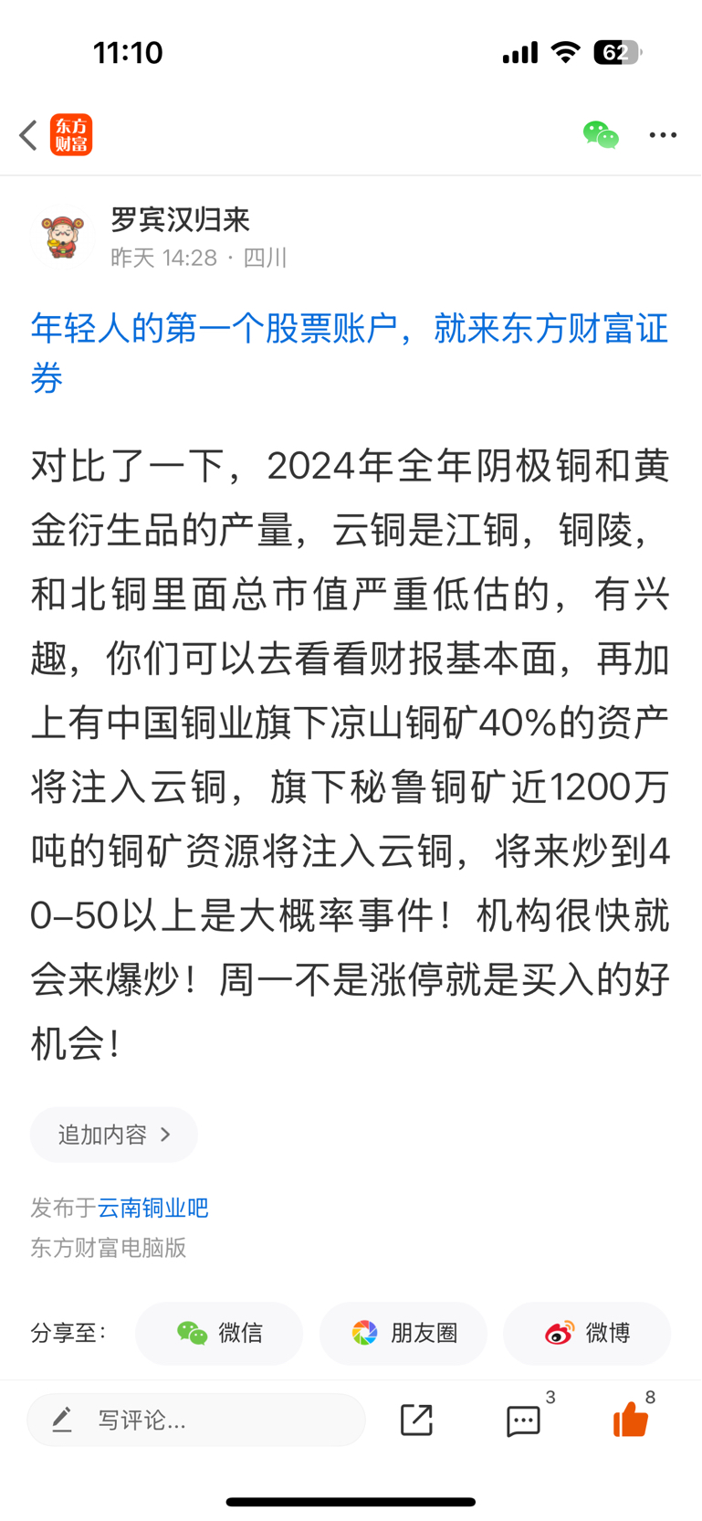 温馨提示: 1.根据《证券法》规定,禁止编造、传播虚假信息或者误导性信息,扰乱证券市场;2.用户在本社区发表的所有资料、言论等仅代表个人观点,与本网站立场无关,不对您构成任何投资建议。用户应基于自己的独立判断,自行决定证券投资并承担相应风险。《东方财富社区管理规定》