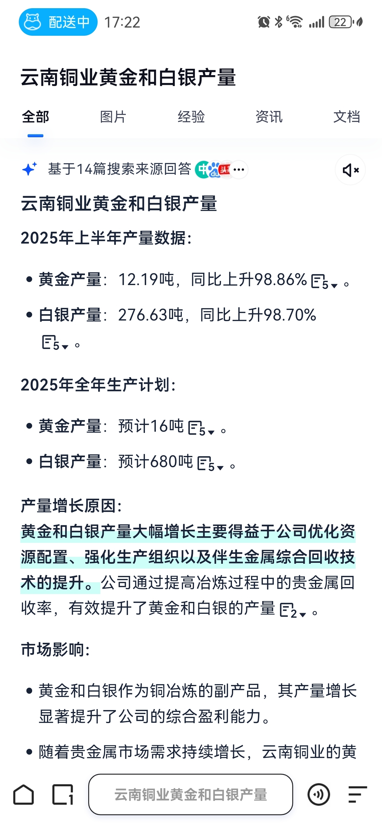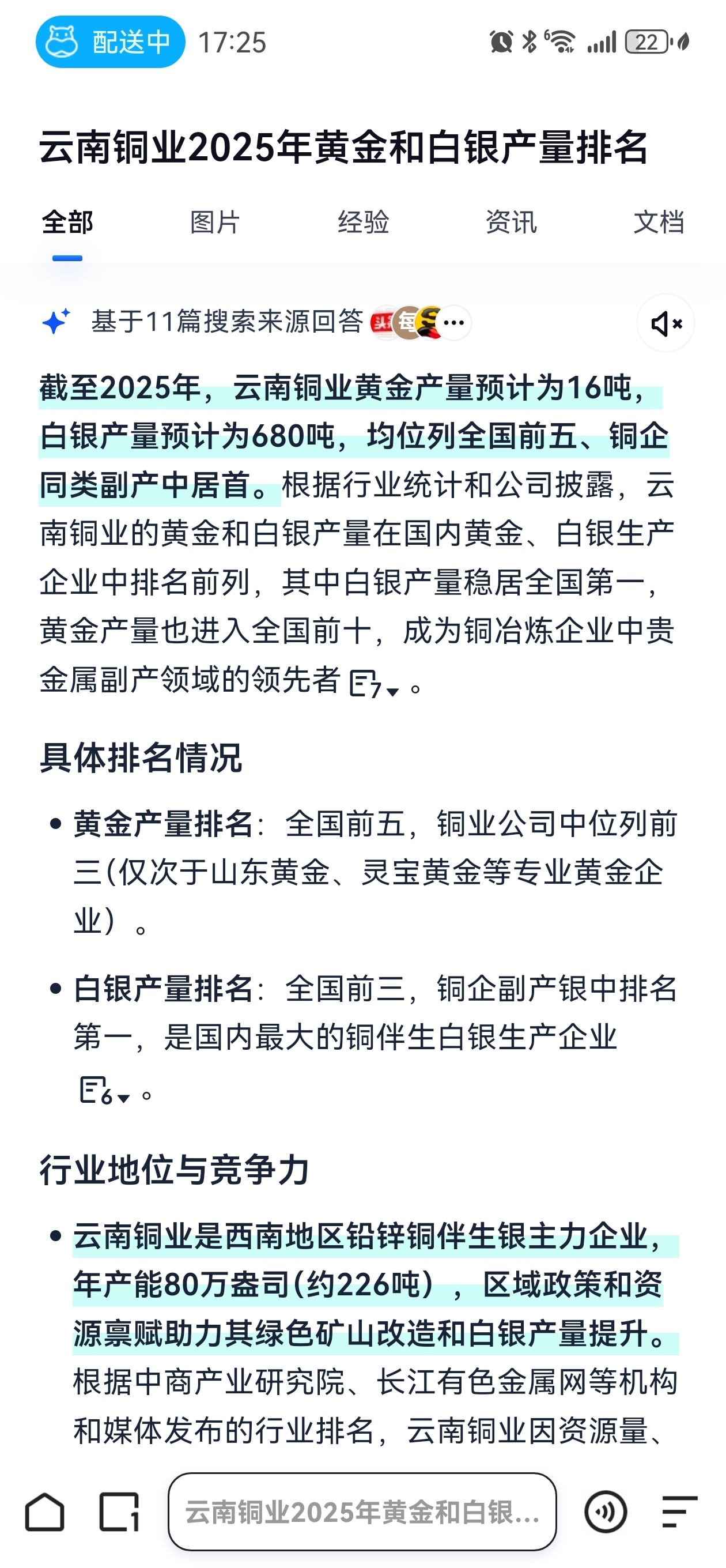 云南铜业2025年黄金产量排第三,白银产量排第一。