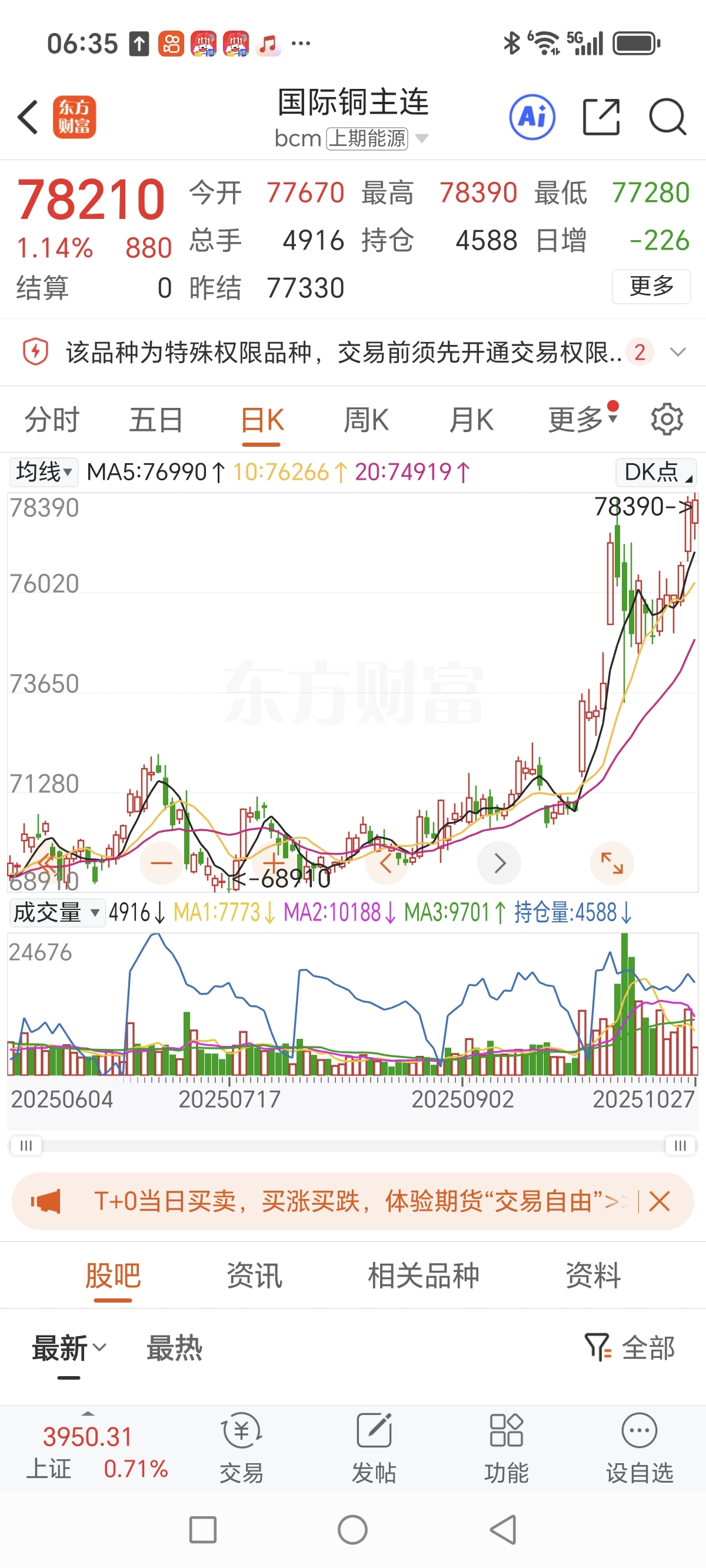 $云南铜业(SZ000878)$ 铜期货交易突破历史新高,下周一大幅高开。