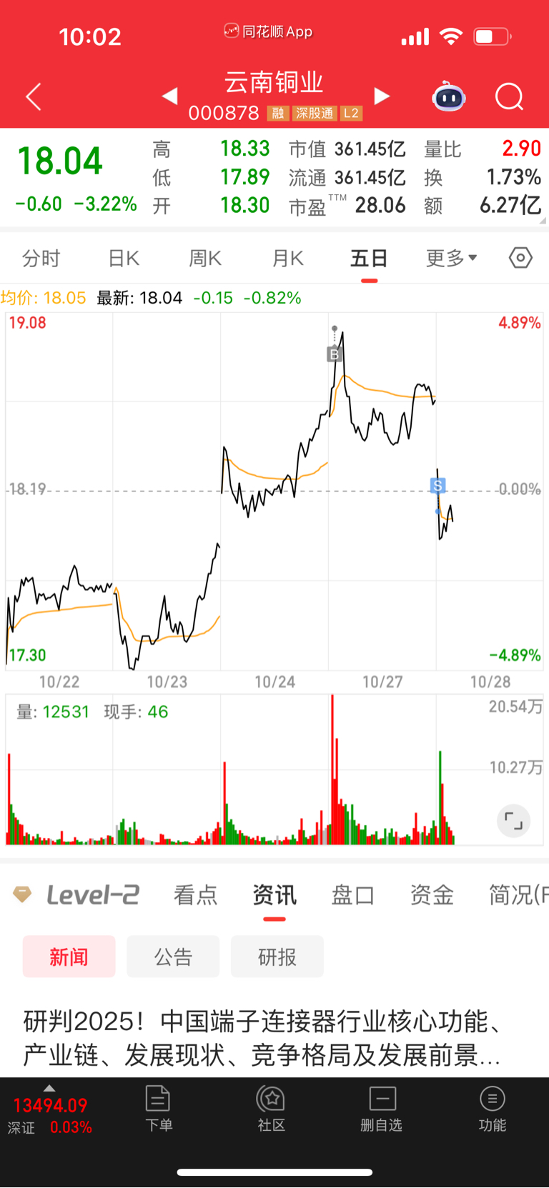 $云南铜业(SZ000878)$ 昨天上午看量价齐升,买在最高,打野失败,今低开低走,斩仓出局