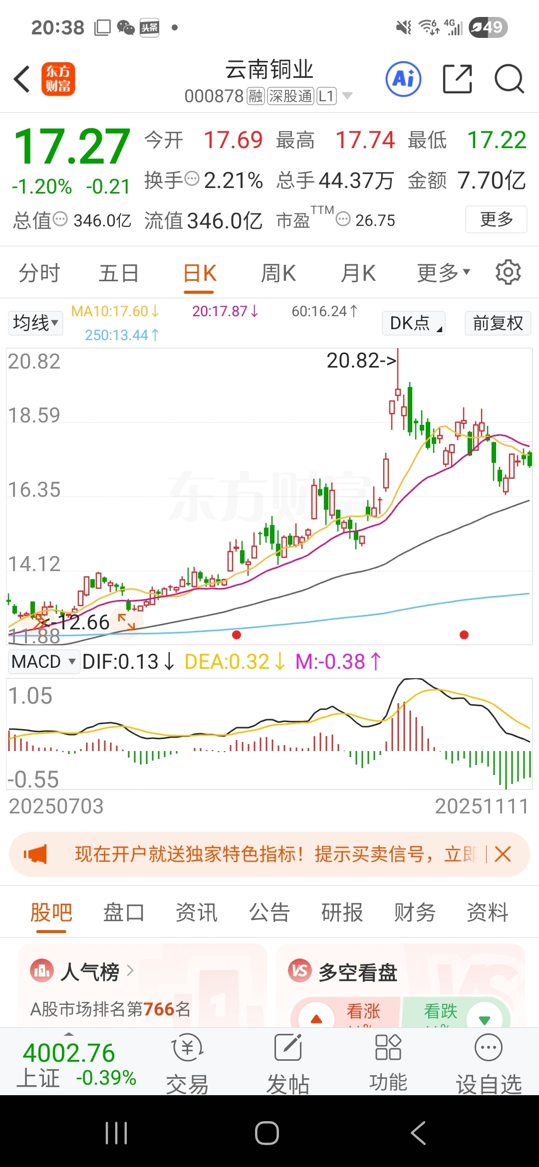 $云南铜业(SZ000878)$ 来,那帮忽悠小散接盘的苟托看过来,日K下行趋势,MACD大开口向行,绿柱并未显著缩短,这不是接飞刀是啥?