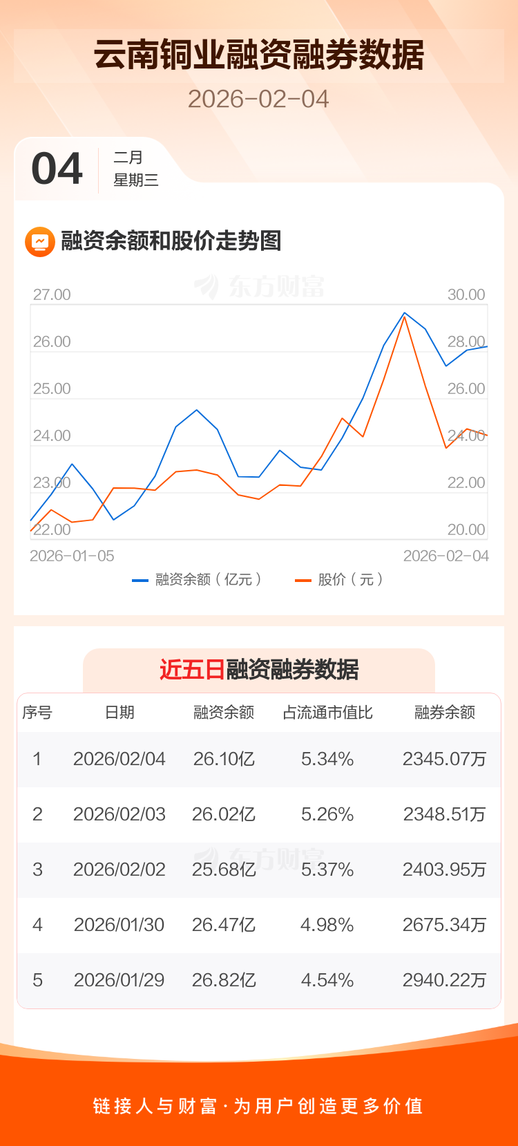 交易所最新数据显示,云南铜业于2026年2月4日获融资买入3.07亿元,融资偿还2.99亿元,当日融资净买入795.89万元。目前,该股融资余额26.10亿,占流通市值比例为5.34%。