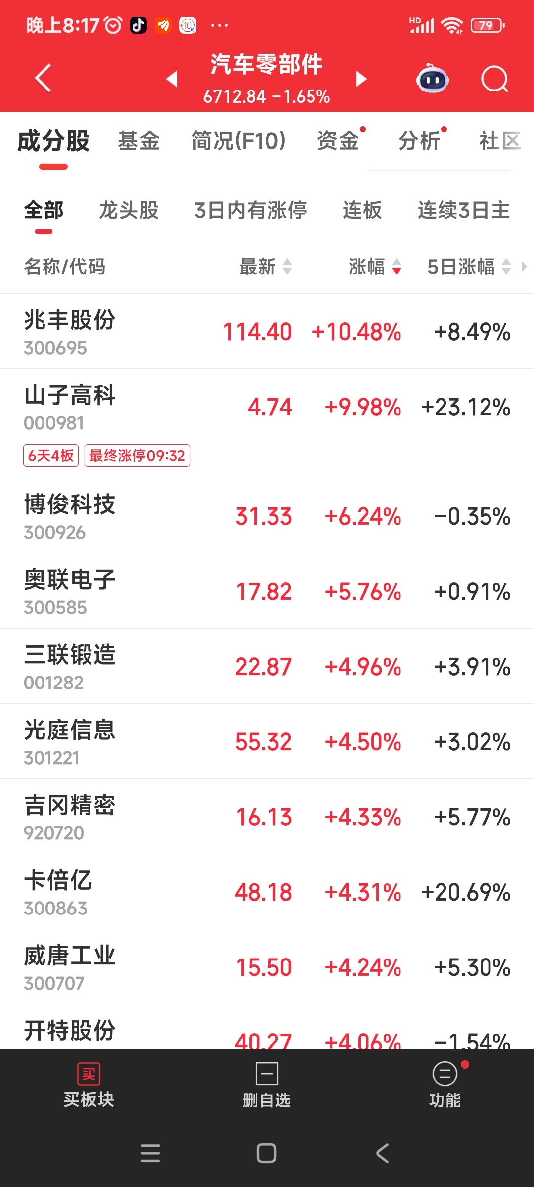 这货居然有汽车零部件概念,板块兆丰114元收盘10%;山子涨停;真的板块跌最久没