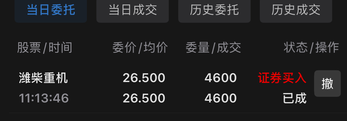 $潍柴重机(SZ000880)$ 这个能买进去没谁了,挂单26.5成交了