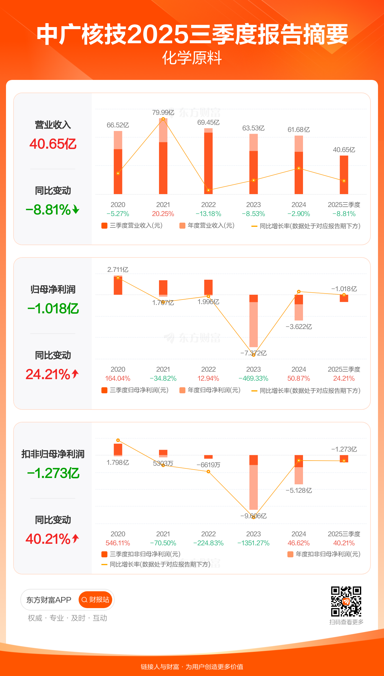 中广核技10月31日发布2025年三季报显示,公司前三季实现营业收入40.65亿元,同比下滑8.81%;归母净利润-1.02亿元;扣非归母净利润-1.27亿元。