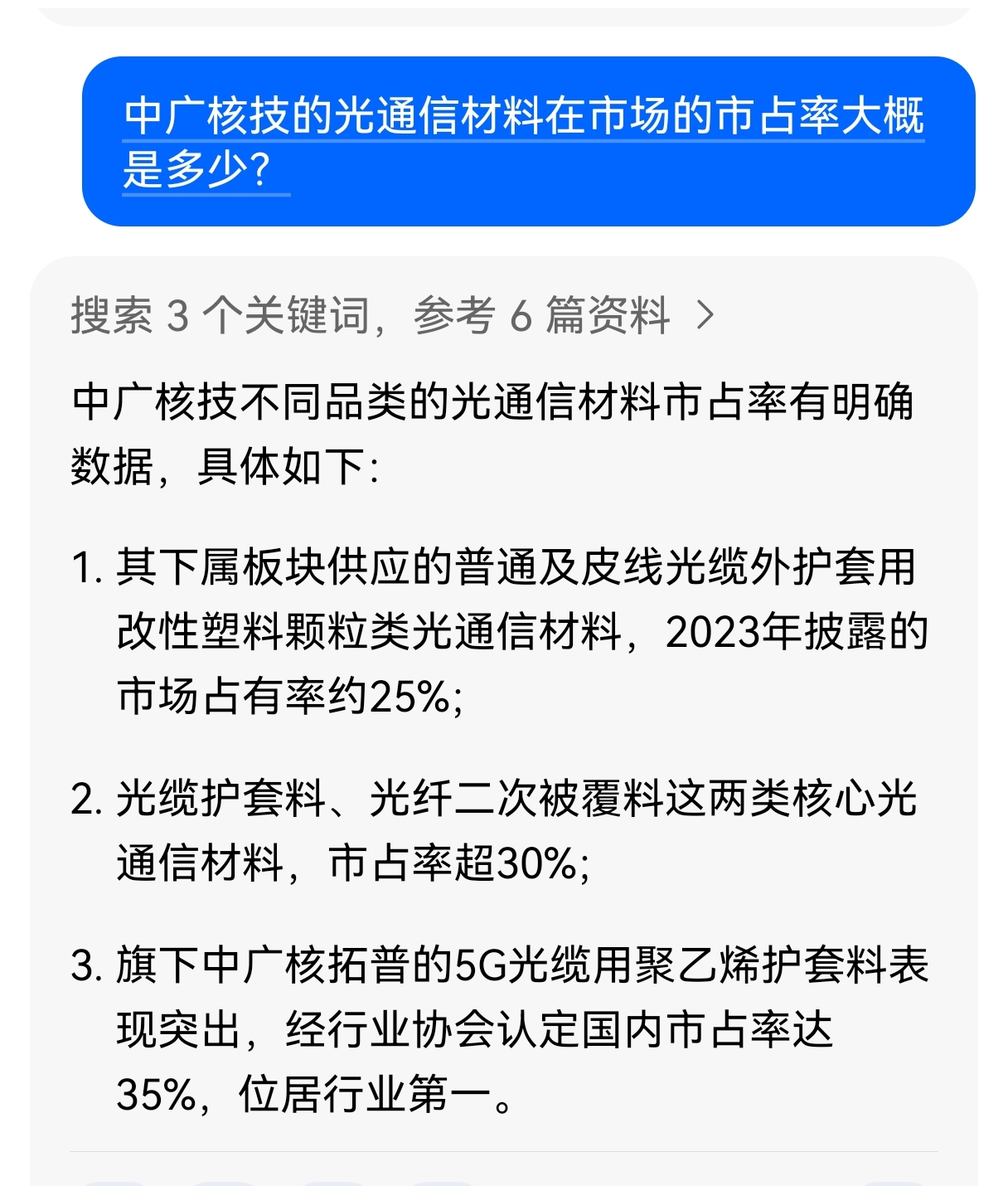 $中广核技(SZ000881)$ 航天线缆你说刚国产替代,技术突破还未形成市场就罢了。光通信材料市占率这么高,居然也是毫无表现?