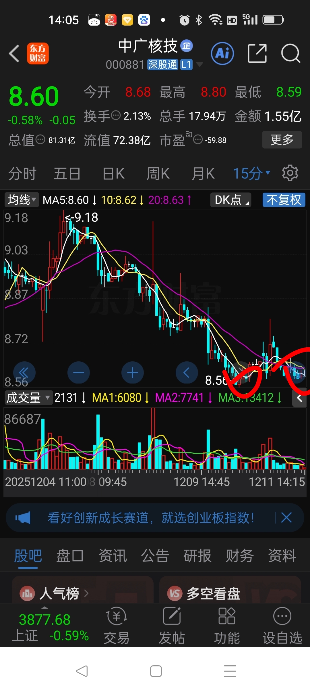 $中广核技(SZ000881)$ 小双底形成