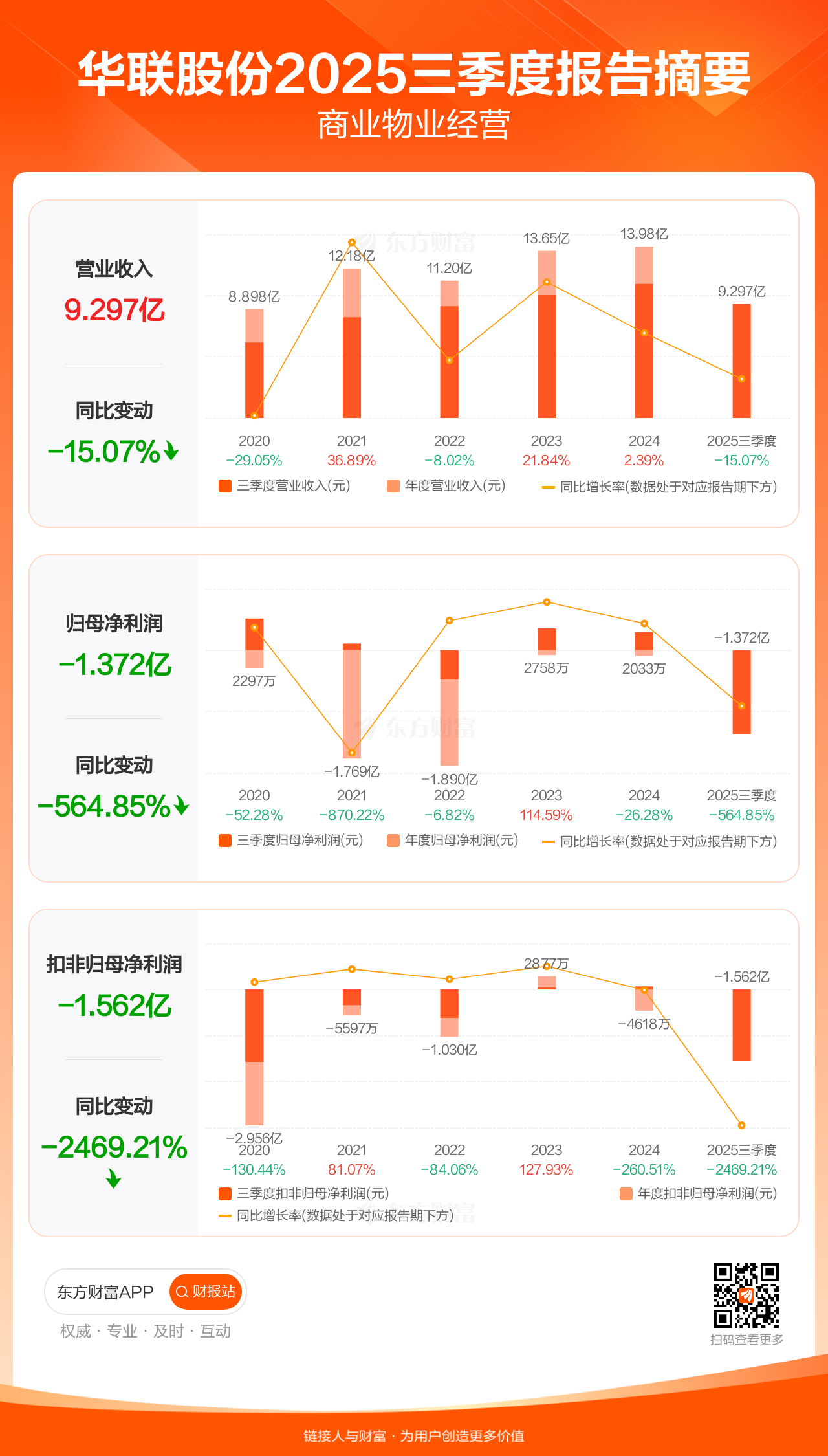华联股份10月30日发布2025年三季报显示,公司前三季实现营业收入9.30亿元,同比下滑15.07%;归母净利润-1.37亿元;扣非归母净利润-1.56亿元。